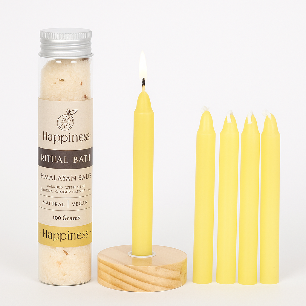 HAPPINESS - Immerse yourself in the joyful experience with this happiness ritual kit. This delightful set includes ritual bath salts, 4 sunny yellow spell candles in sunny and a charming candle holder. Our vegan and all-natural bath salts, infused with zesty lemon and invigorating ginger, will elevate your mood and help you manifest your desires while soaking in a happiness bath.